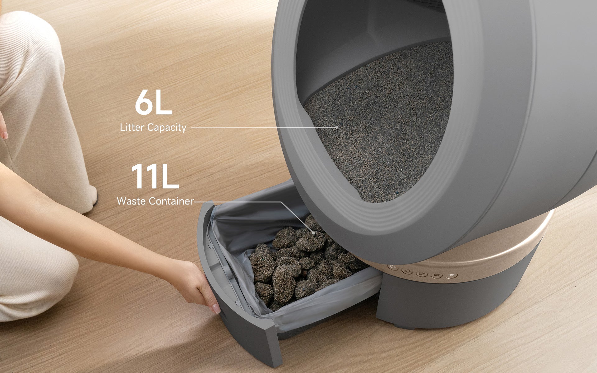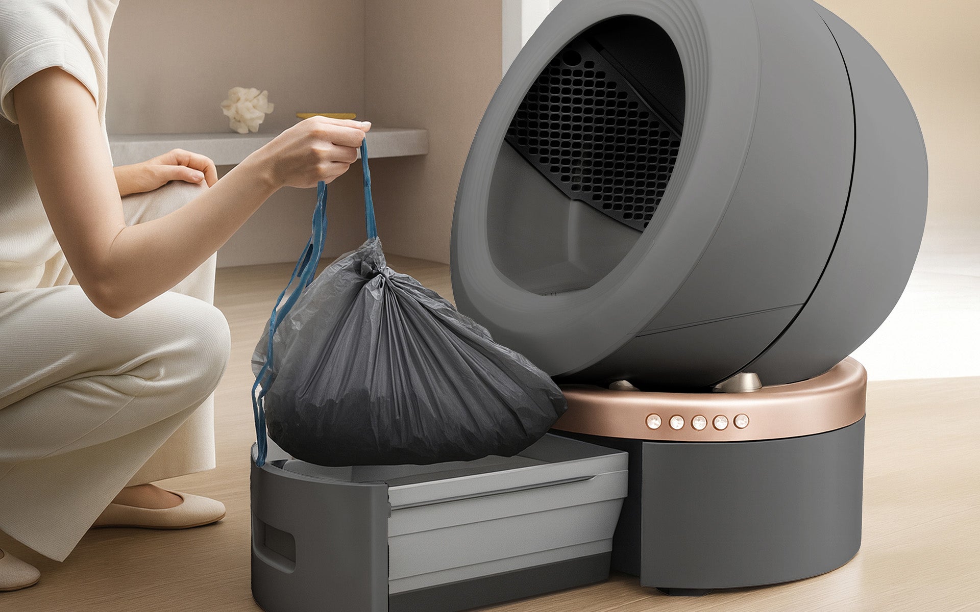 Med handtaget upptill kan du lyfta ut den med ett enkelt drag. Den runda behållaren i plast och ströbehållaren kan sköljas på några sekunder och sedan snabbt sättas tillbaka på plats, utan någon kontakt med kattens avföring.