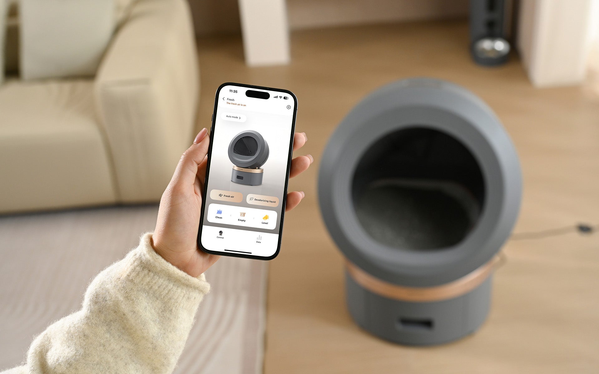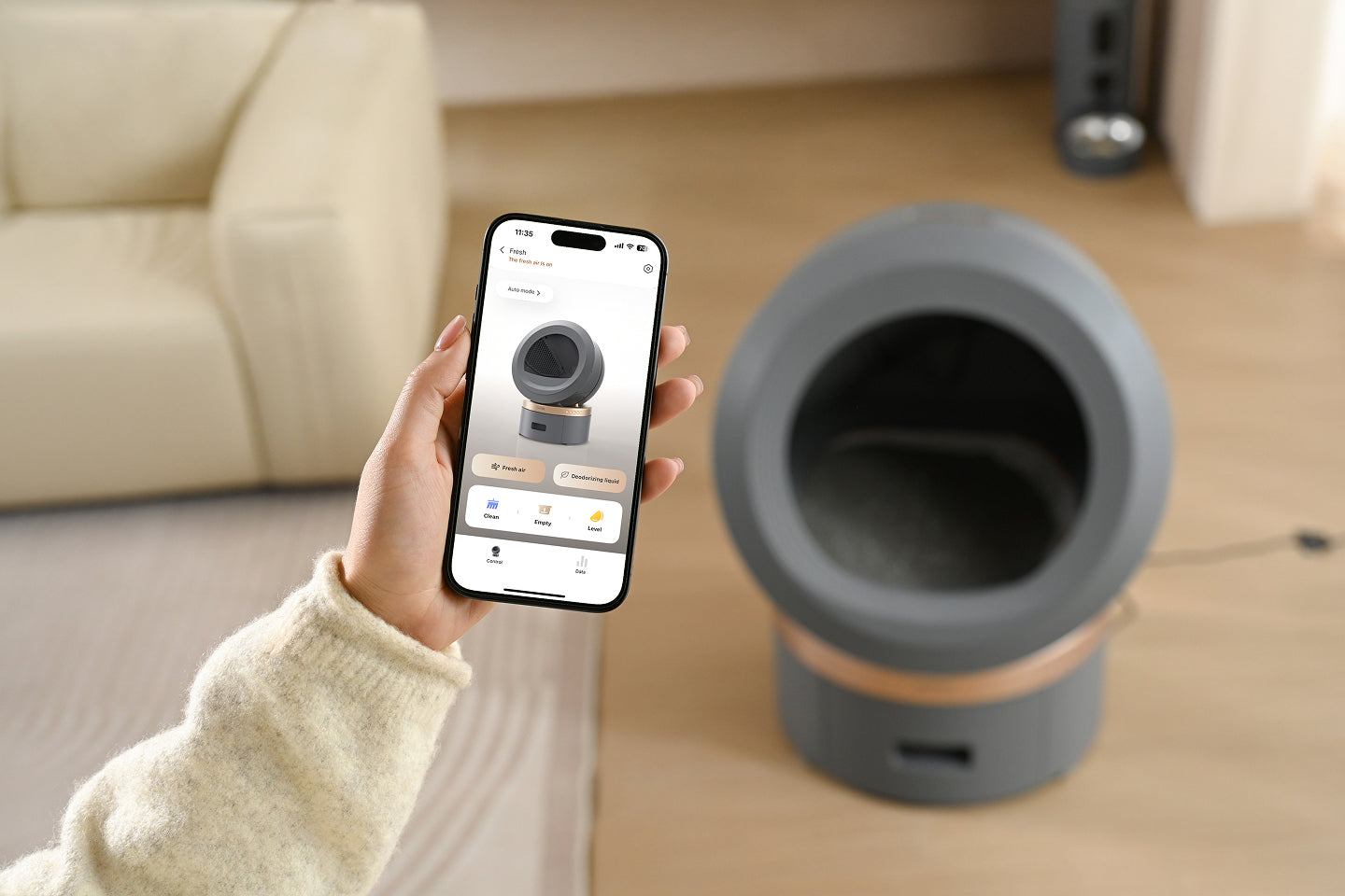 Användaren kan justera funktionerna för luktneutralisering och avföringshantering efter behov. Den automatiska självkontrollen registrerar avvikelser eller brist på förnödenheter. Oavsett om du är på semester eller på jobbet kan du styra den i realtid.