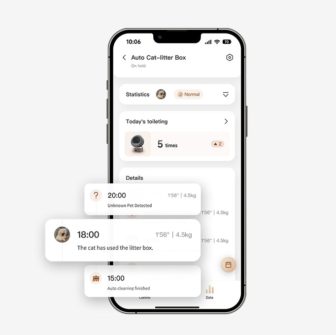 Har stöd för att hantera flera kattprofiler via viktsensorn. Spårar varje katts viktutveckling och toalettvanor individuellt. Hantera husdjursdata under lång tid och upptäck avvikelser tidigt för att minska risken för sjukdom.