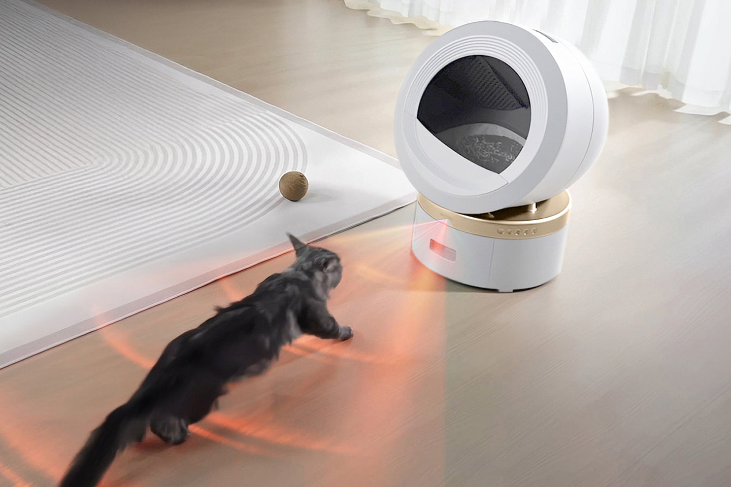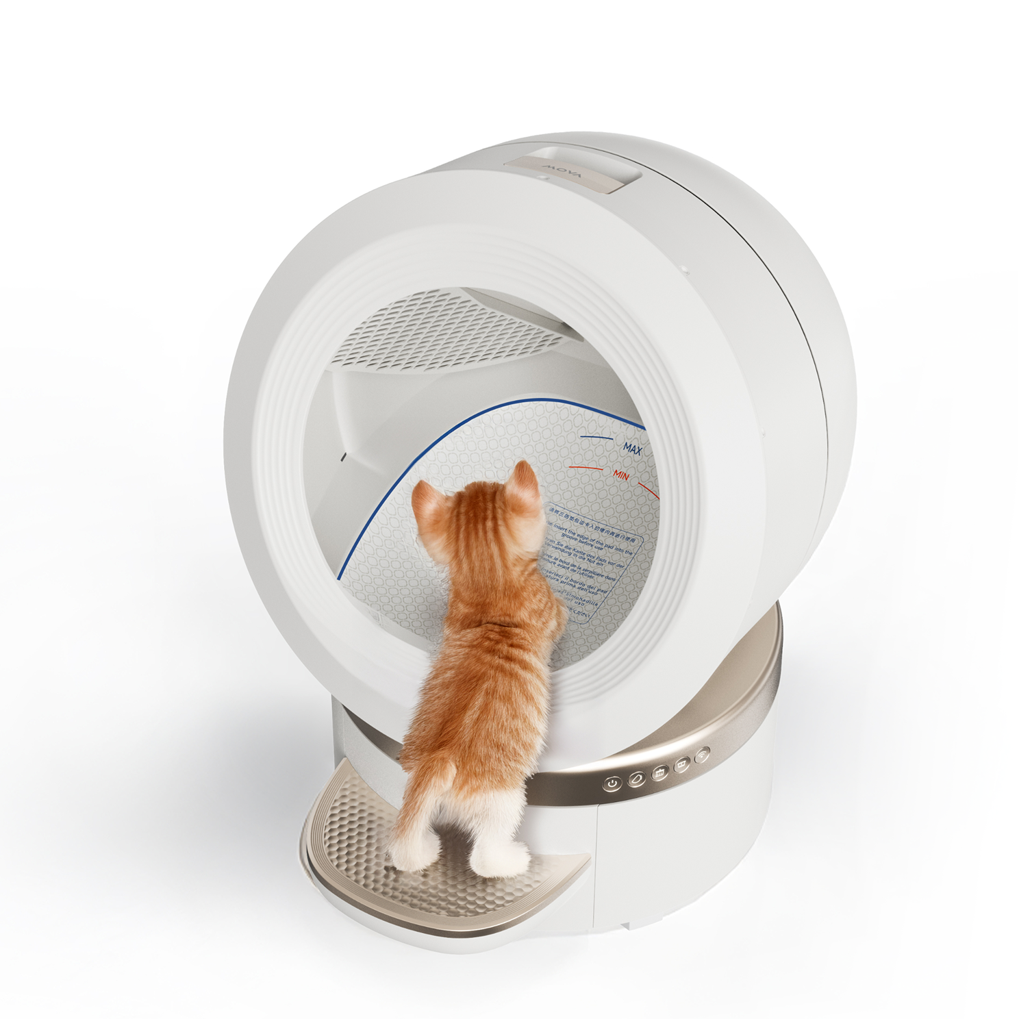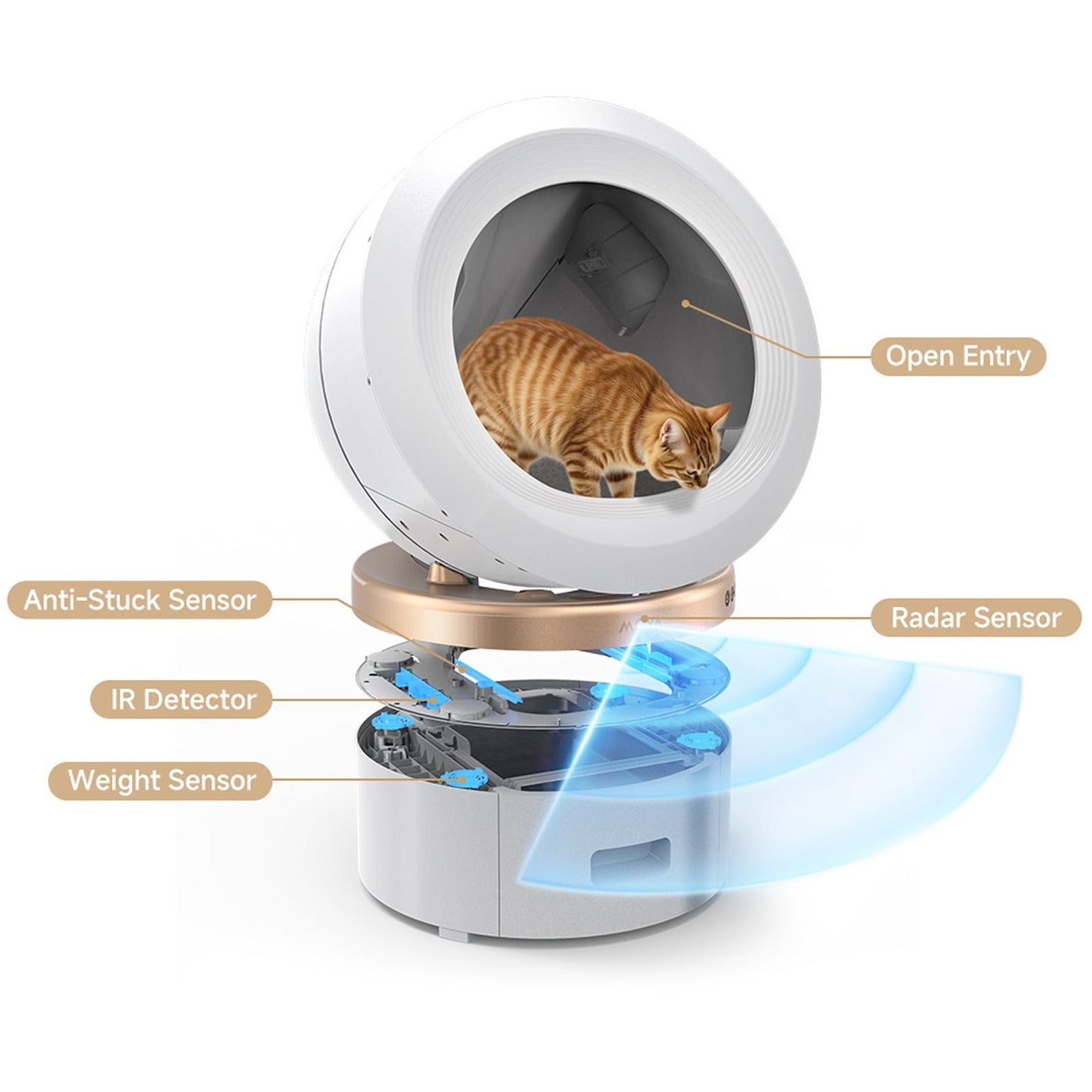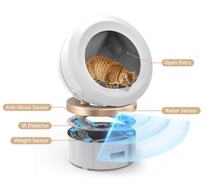Utformad med en öppen ingång för fri passage, och 11 intelligenta sensorer som känner av din katts rörelser i realtid. Kattlådan pausar omedelbart när din katt är i närheten och fortsätter först när området är tomt och säkert.