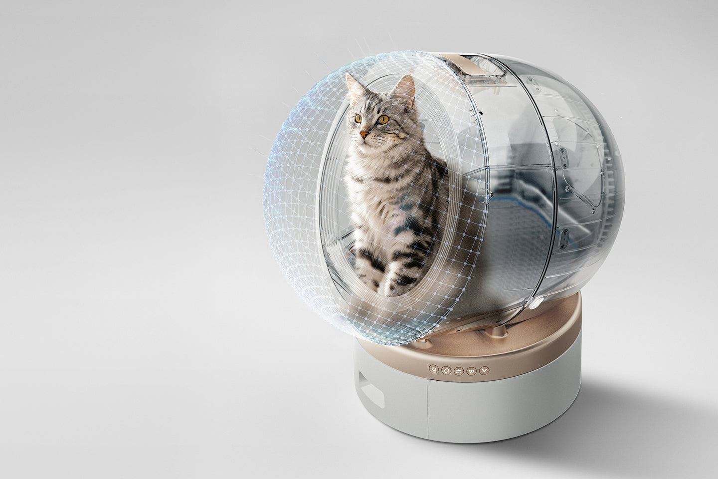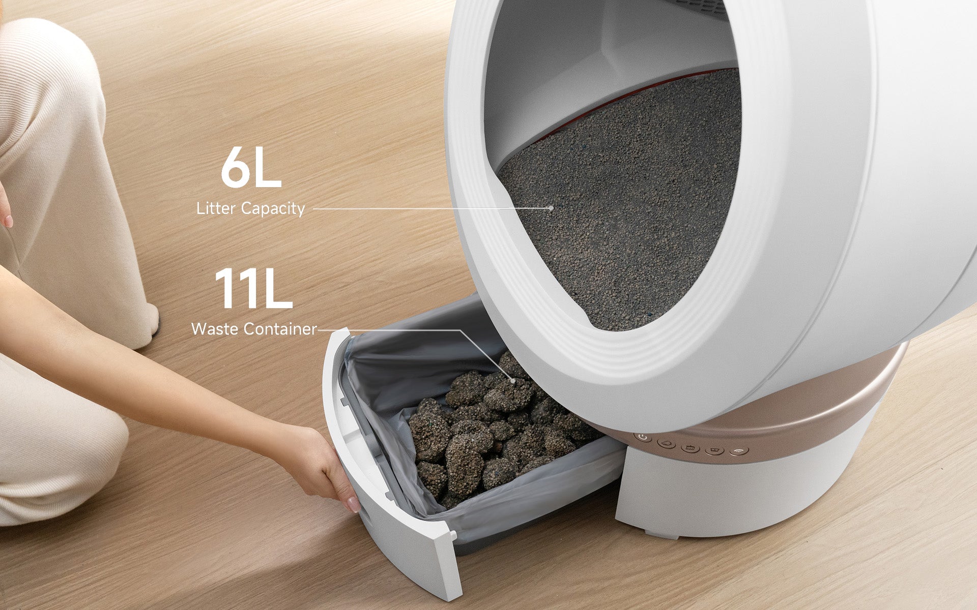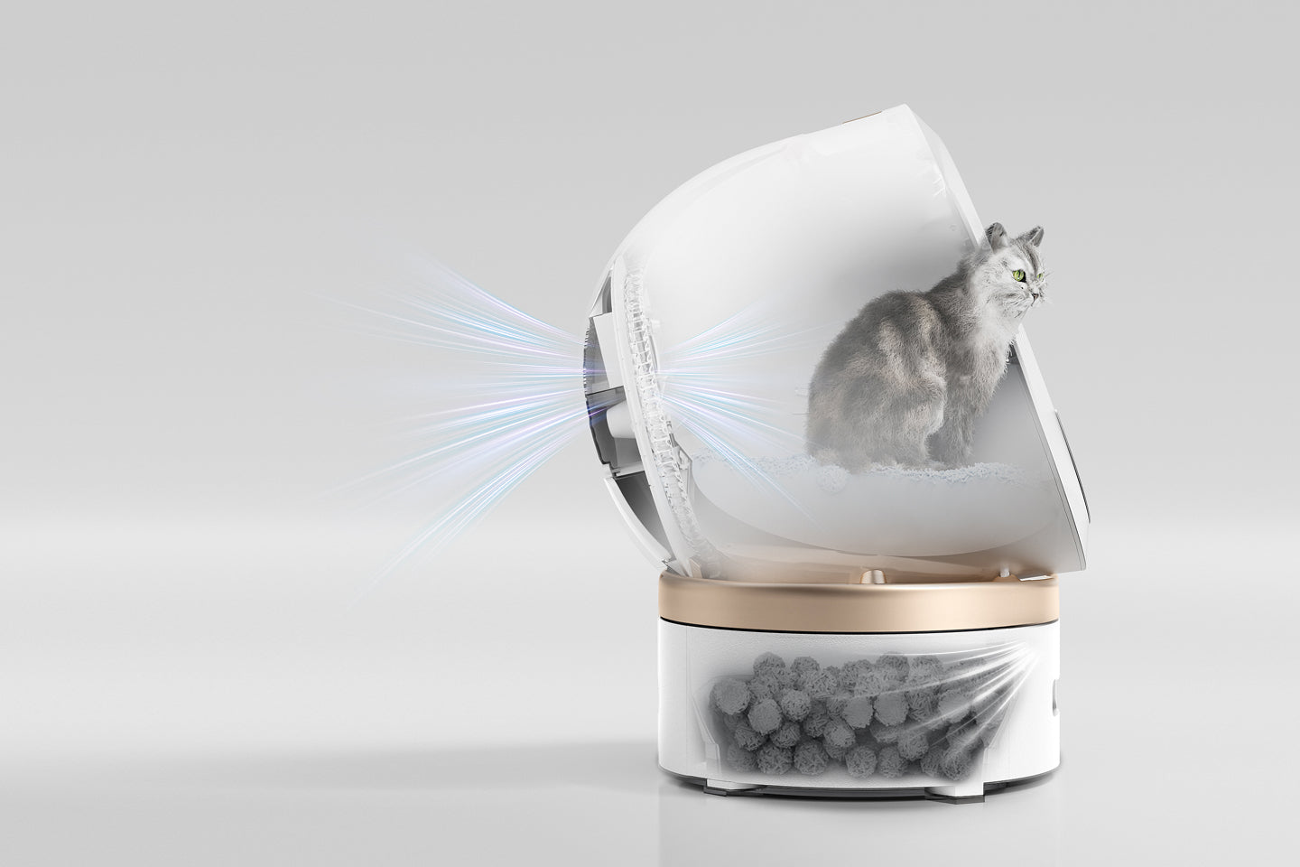 Den halvöppna kupolen på 110 l gör att katten kan behålla sin naturliga upprätta hållning när den använder kattlådan. Den rymliga runda behållaren förhindrar att avföring hamnar i hörnen. Katten kan bekvämt vända sig, gräva ner och täcka över avföringen, vilket uppmuntrar till regelbunden användning.