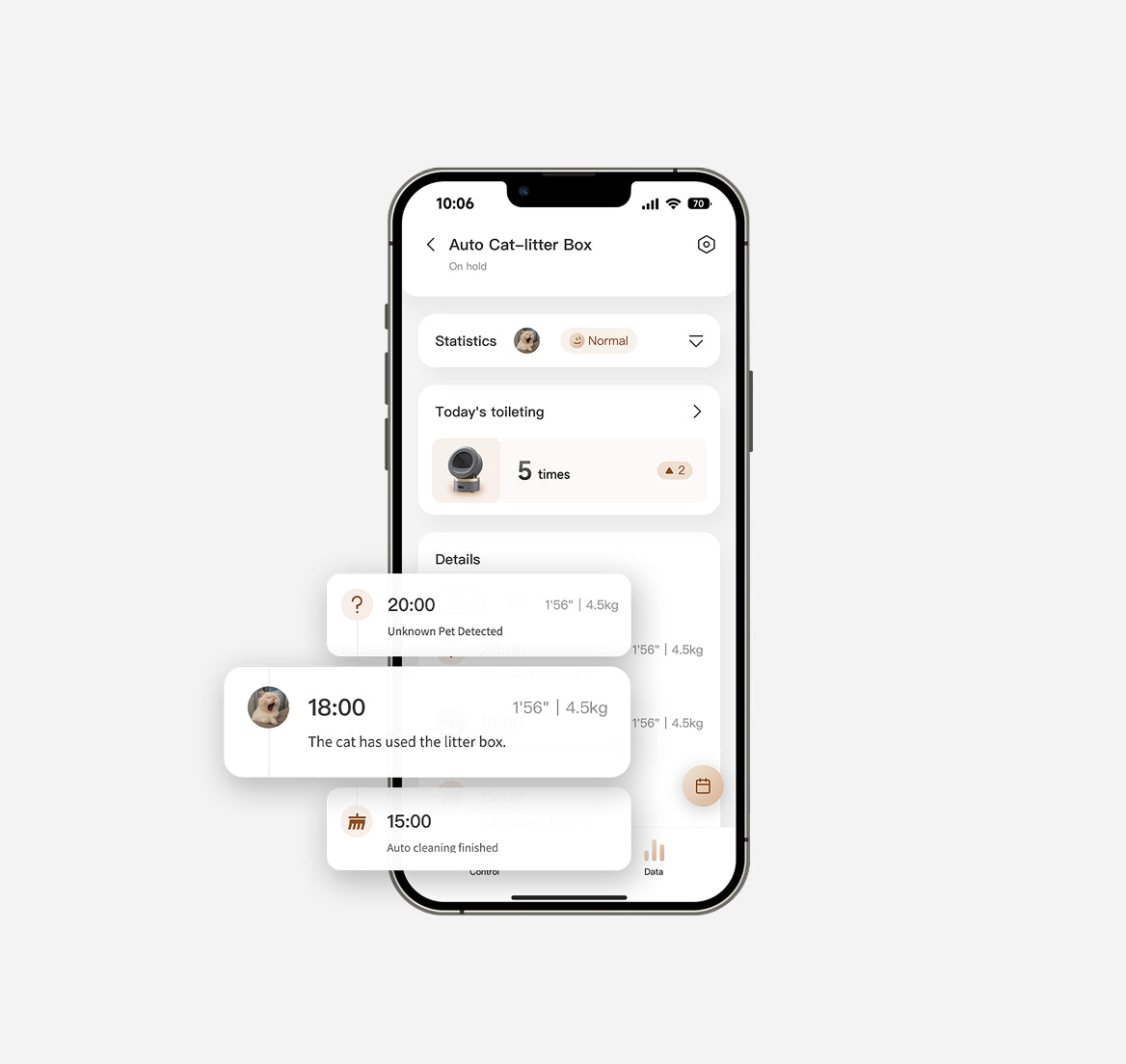 Har stöd för att hantera flera kattprofiler via viktsensorn. Spårar varje katts viktutveckling och toalettvanor individuellt. Hantera husdjursdata under lång tid och upptäck avvikelser tidigt för att minska risken för sjukdom.