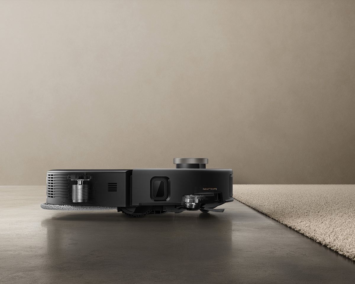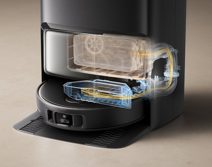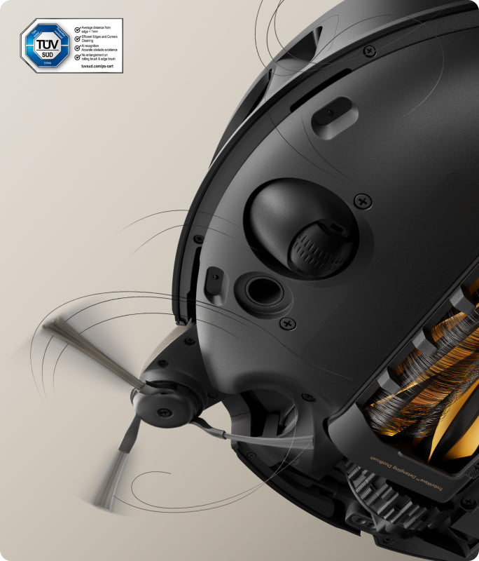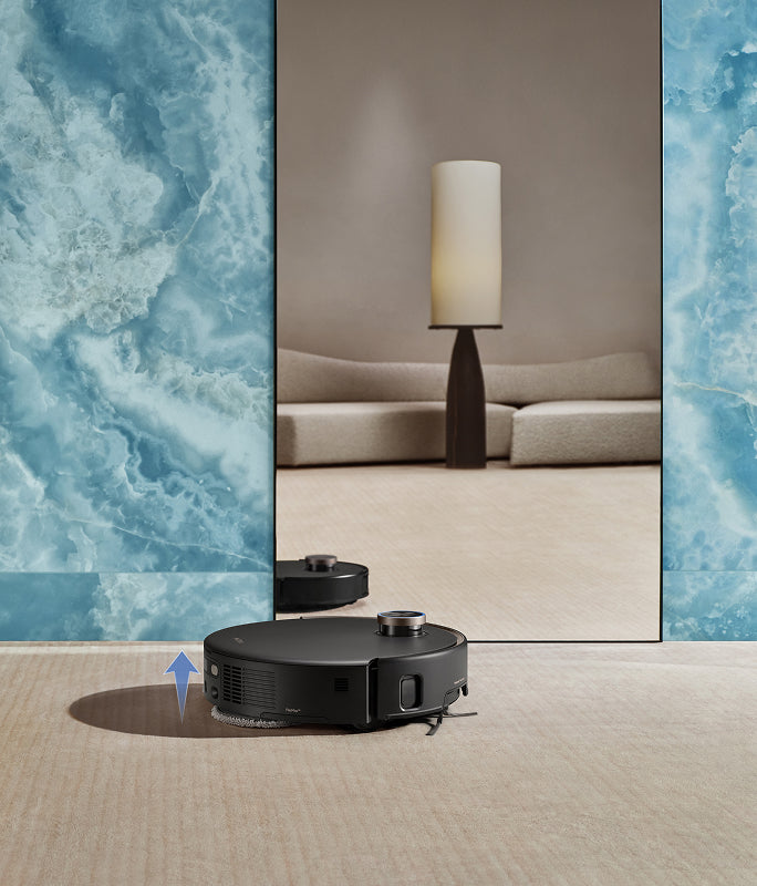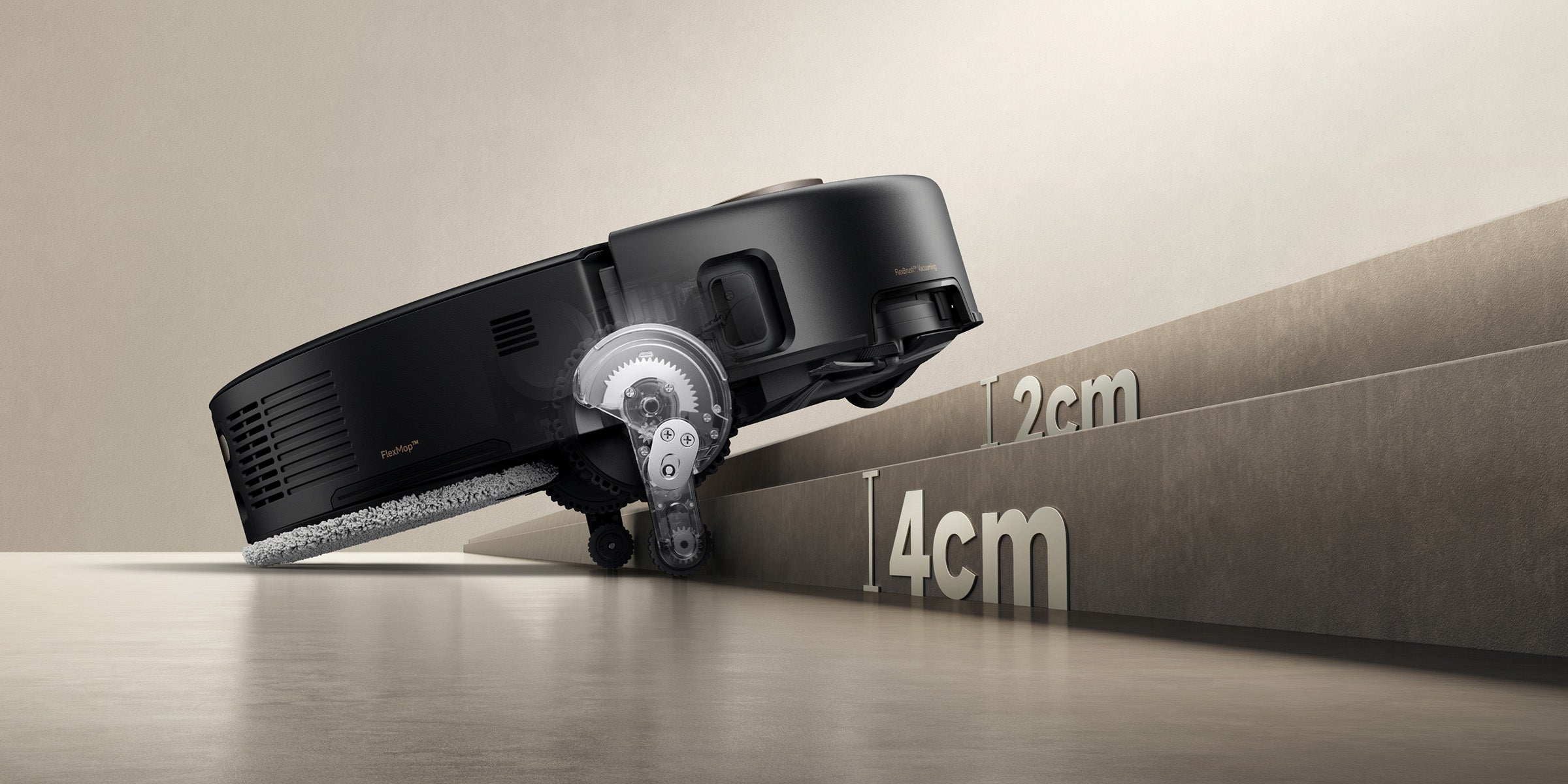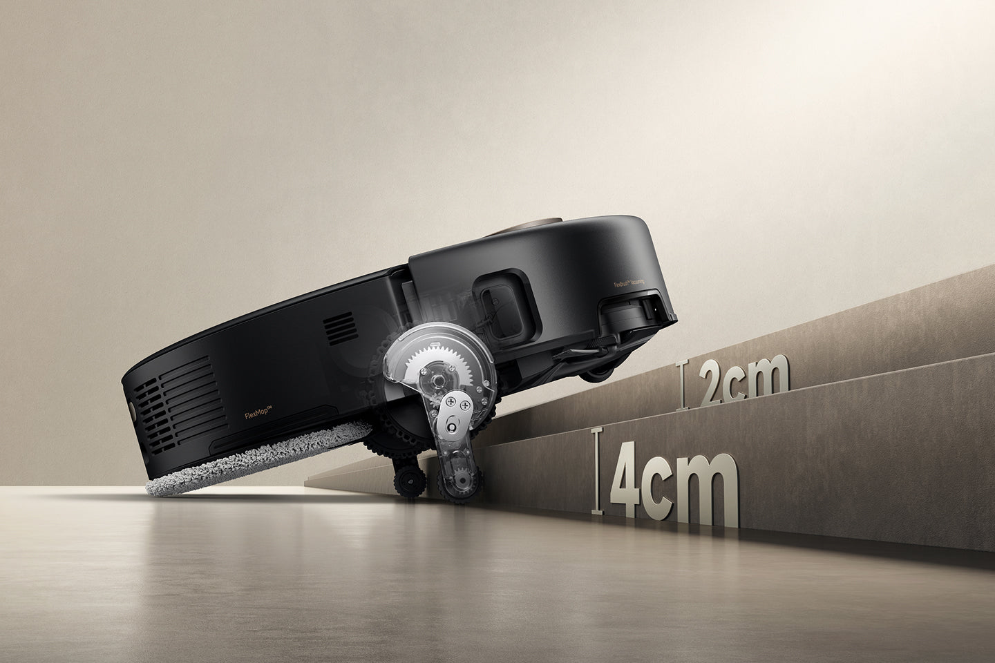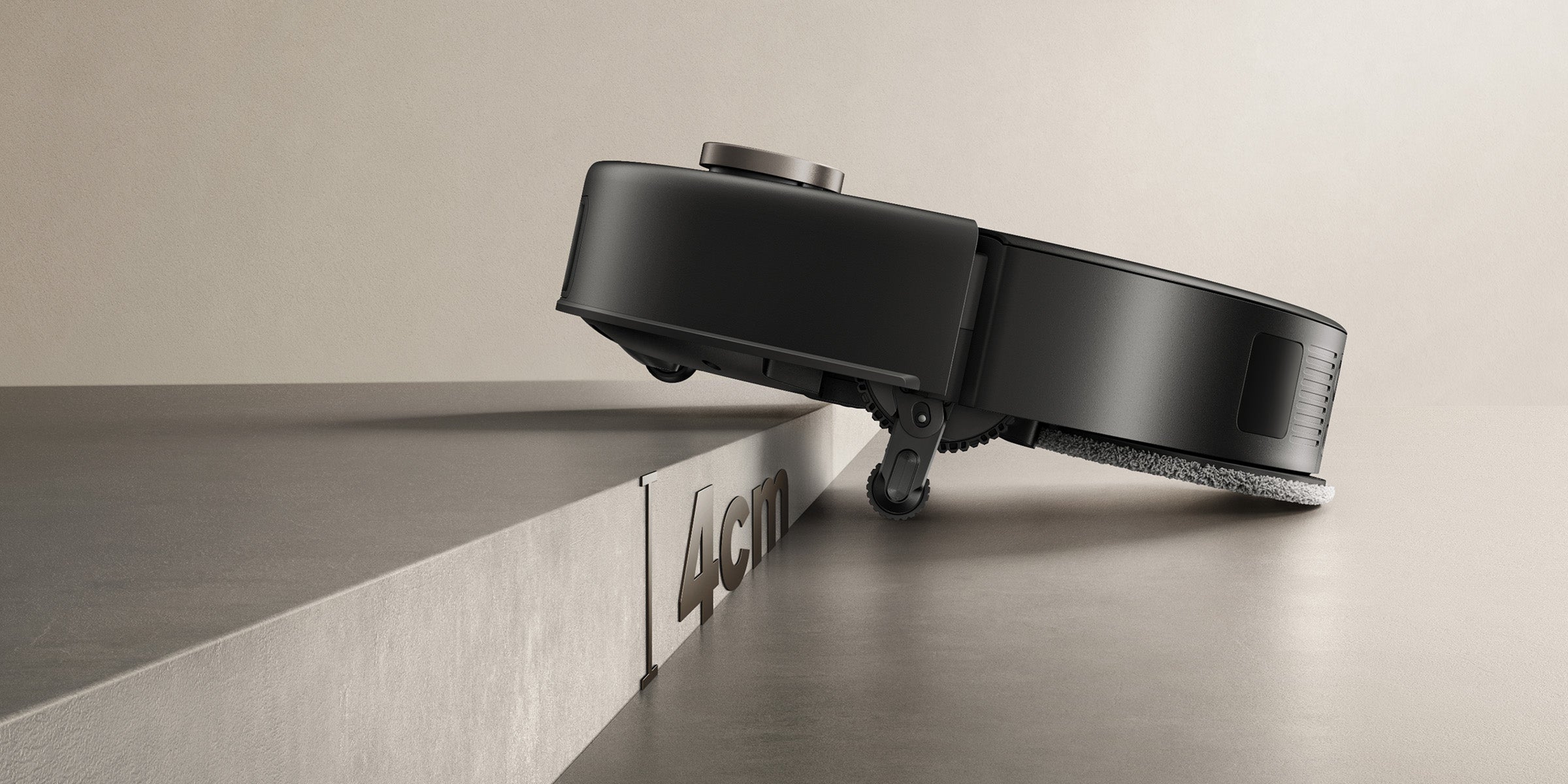 StepMaster™-systemet har ett infällbart robotstöd som kan lyfta chassit och enkelt ta sig över trappsteg, trösklar, dörrskenor, U-formade möbelben och mindre hinder på upp till 6 cm*. Systemet kan enkelt navigera komplexa omgivningar för en grundlig rengöring och smidig återgång till basstationen.