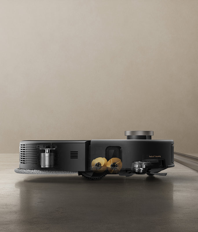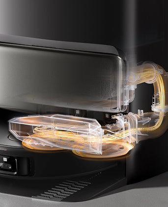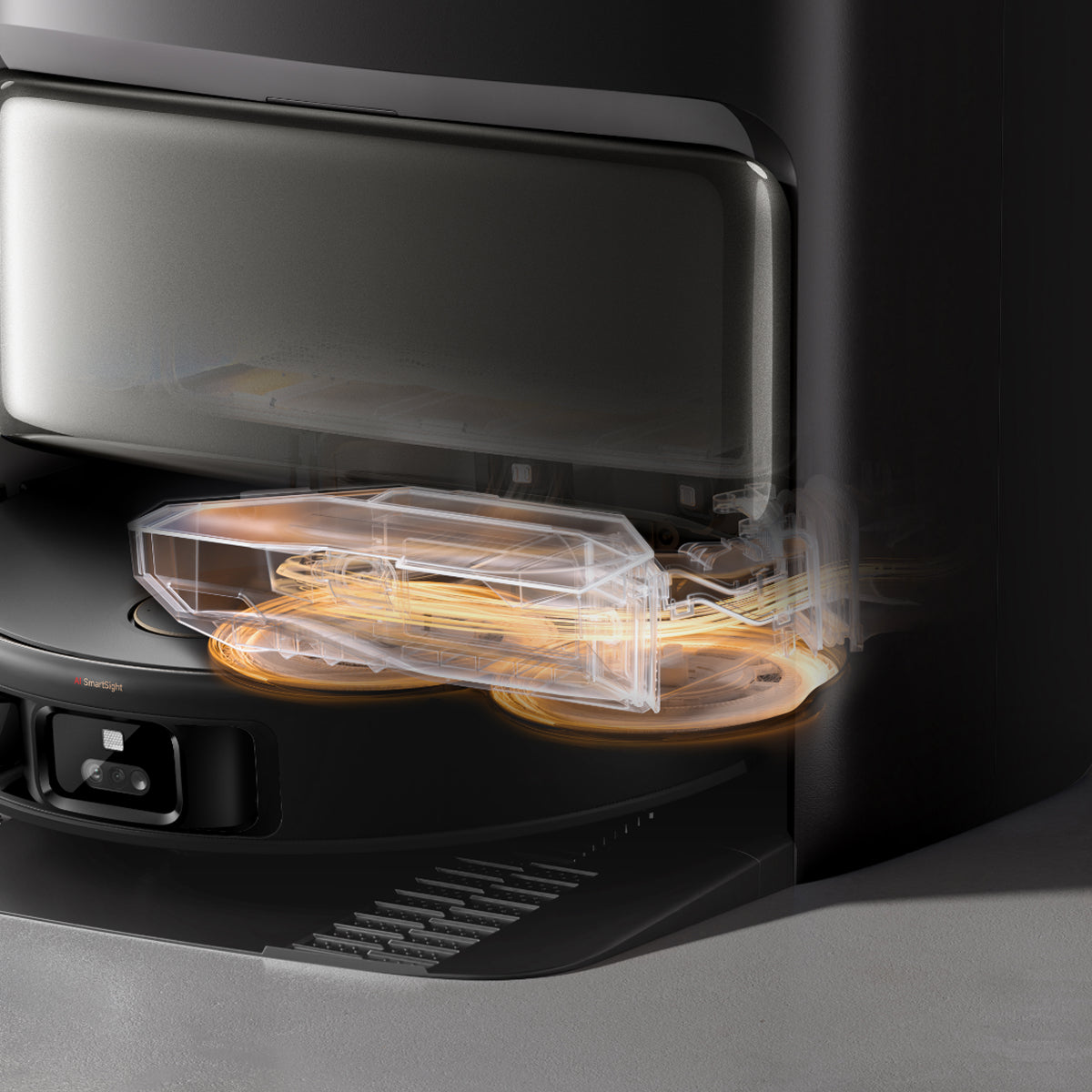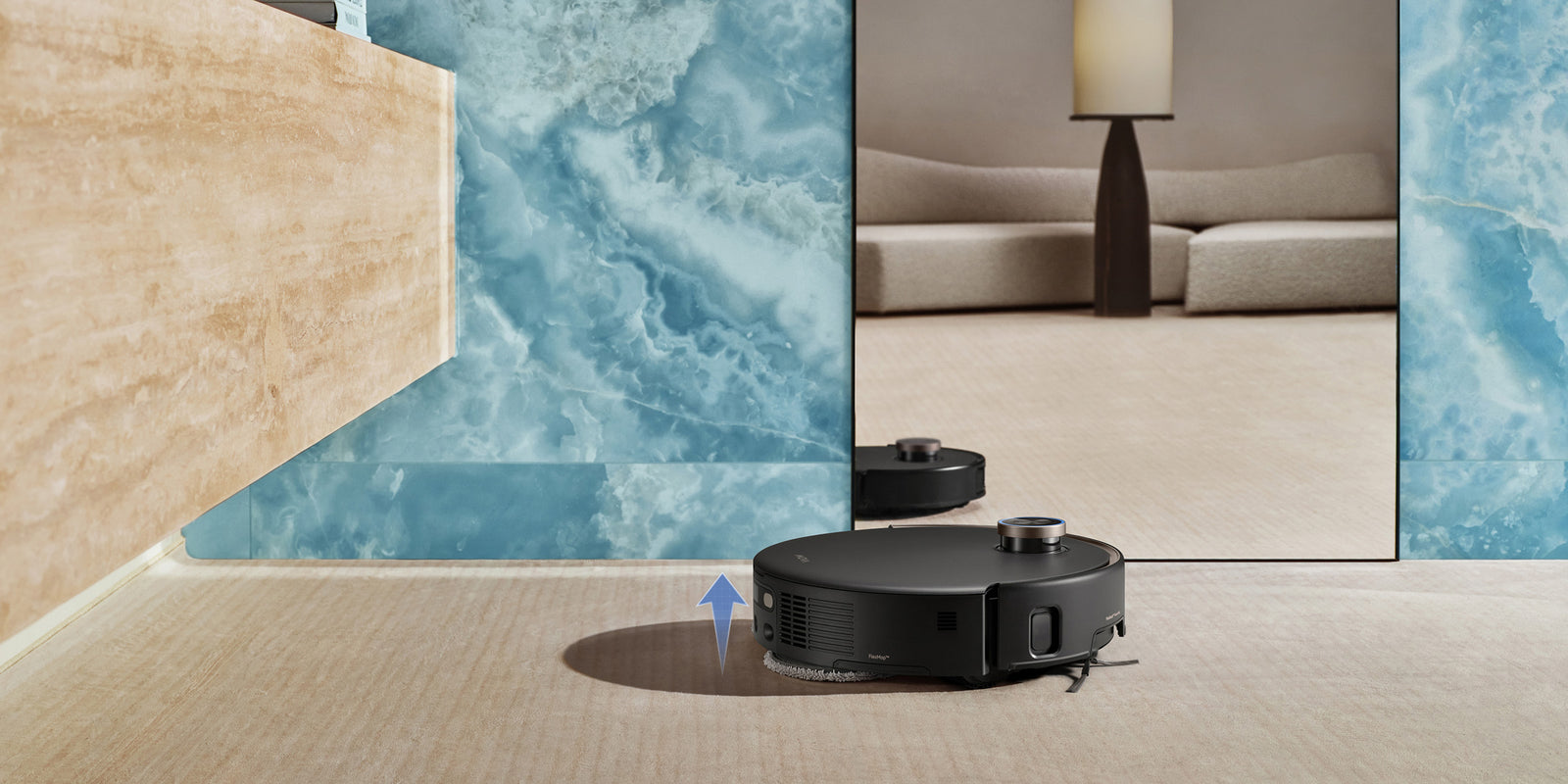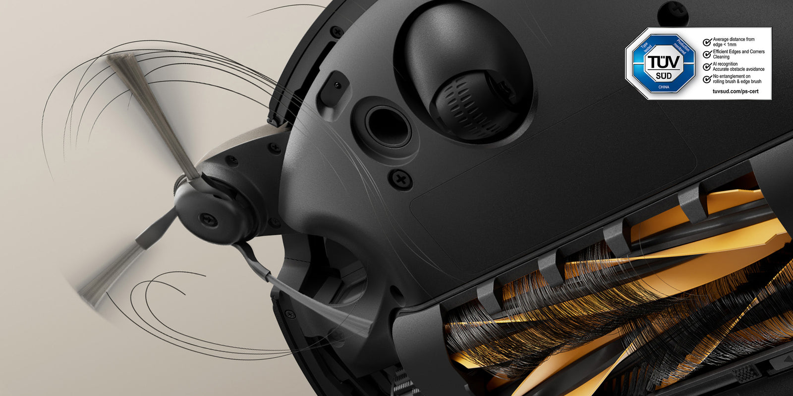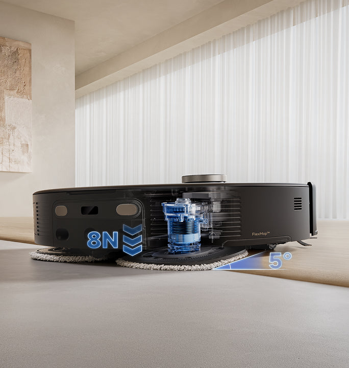 StepMaster™-systemet har ett infällbart robotstöd som kan lyfta chassit och enkelt ta sig över trappsteg, trösklar, dörrskenor, U-formade möbelben och mindre hinder på upp till 6 cm*. Systemet kan enkelt navigera komplexa omgivningar för en grundlig rengöring och smidig återgång till basstationen.