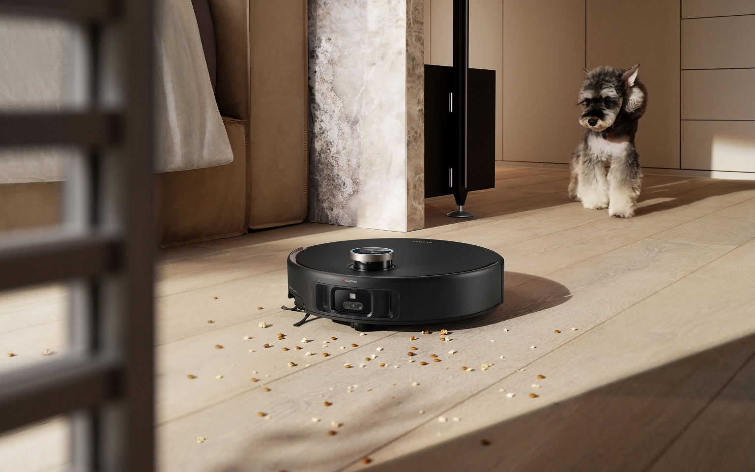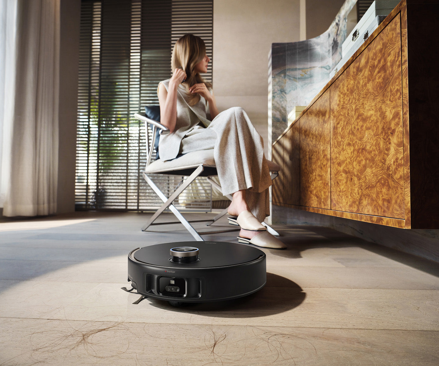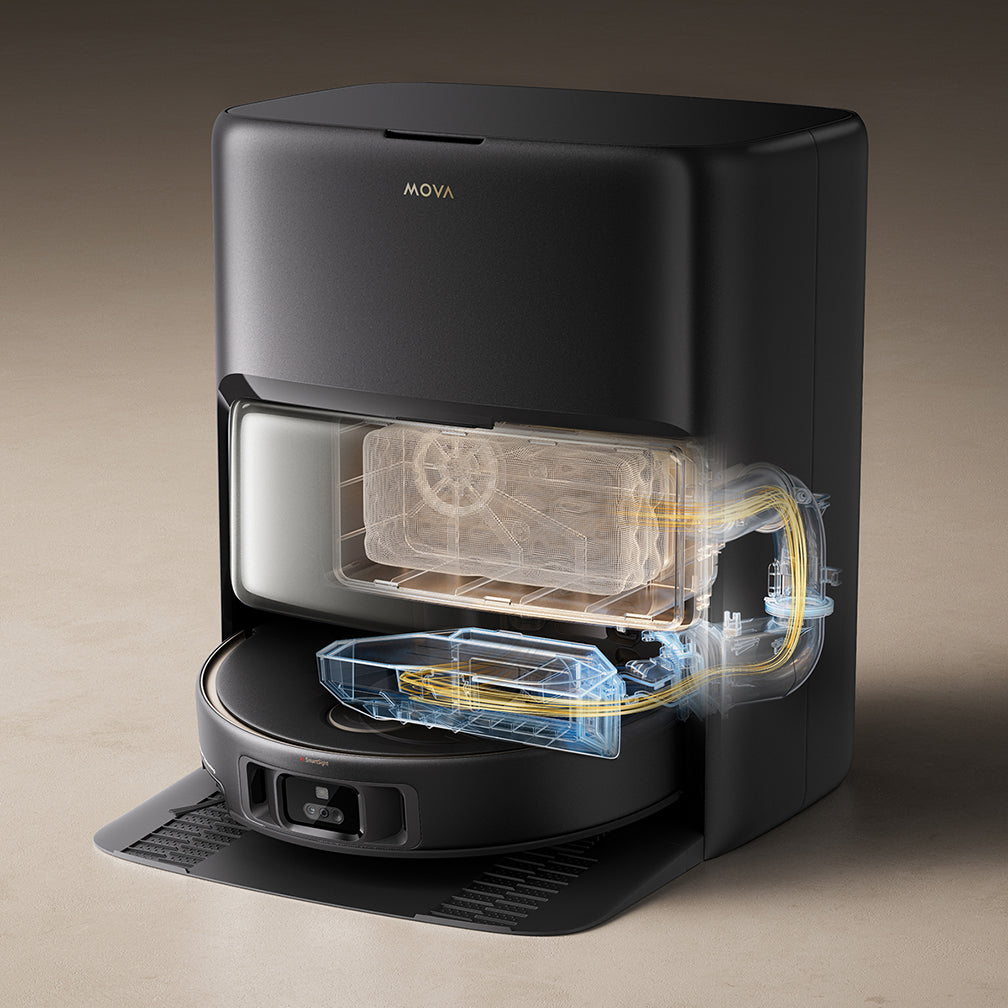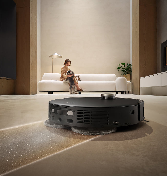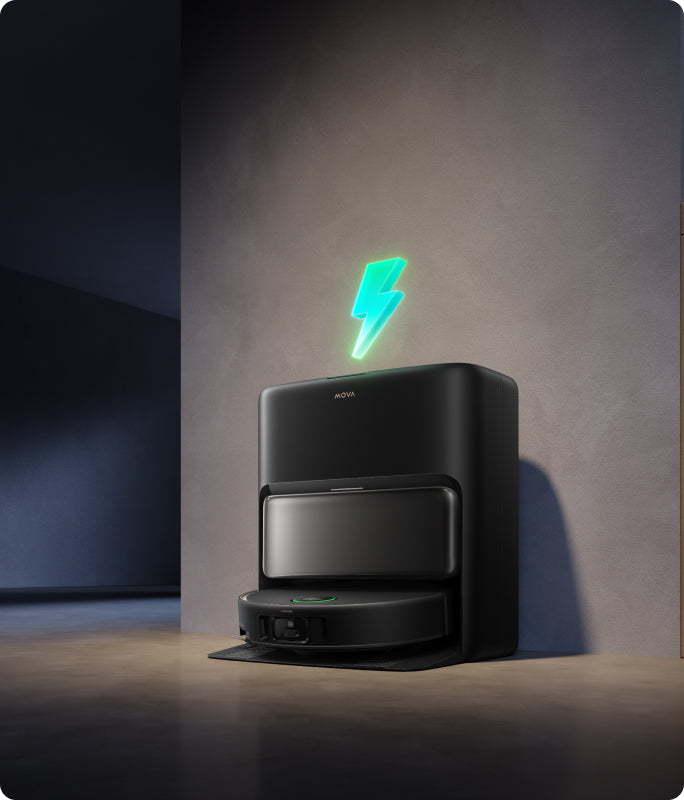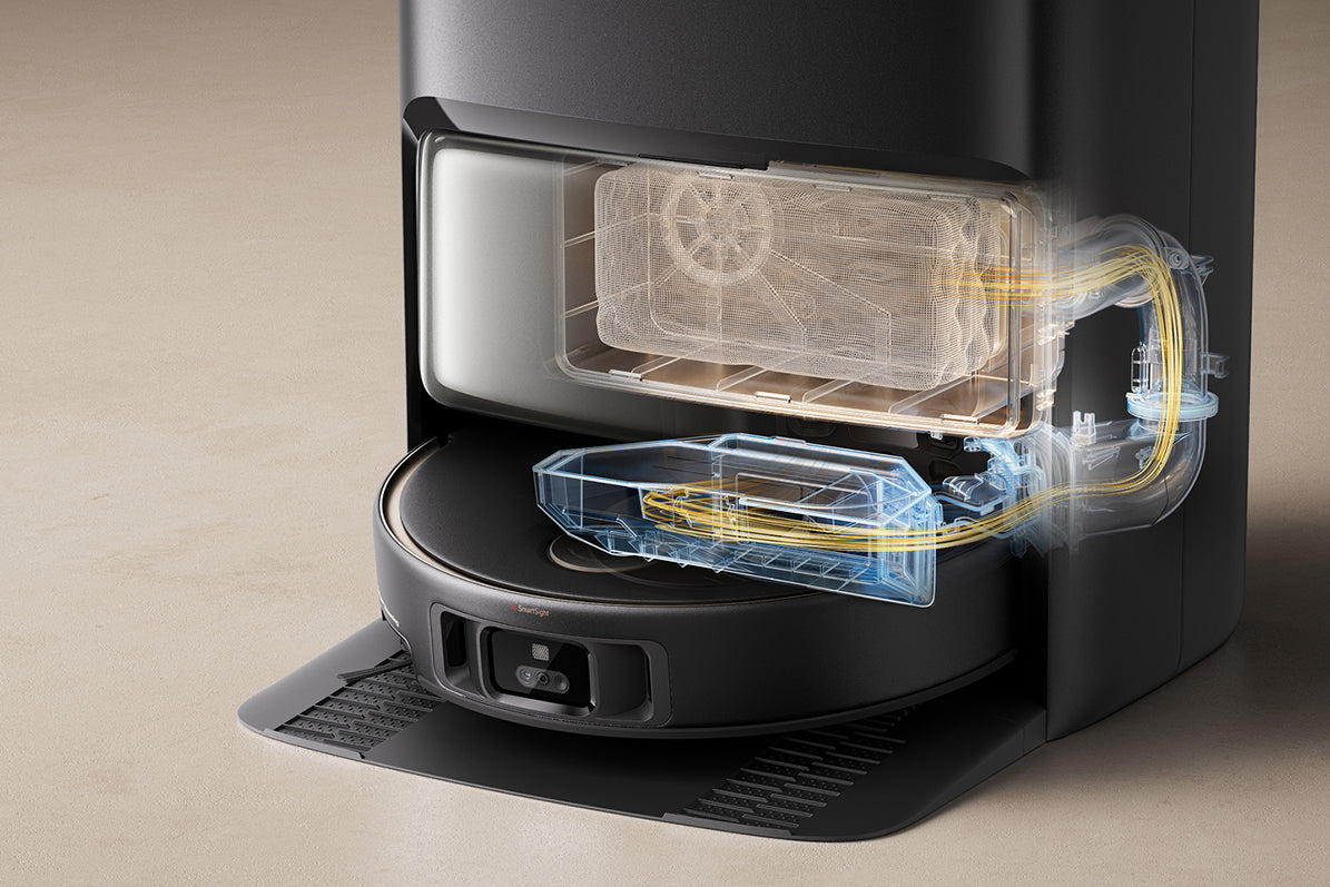StepMaster™-systemet har ett infällbart robotstöd som kan lyfta chassit och enkelt ta sig över trappsteg, trösklar, dörrskenor, U-formade möbelben och mindre hinder på upp till 6 cm*. Systemet kan enkelt navigera komplexa omgivningar för en grundlig rengöring och smidig återgång till basstationen.